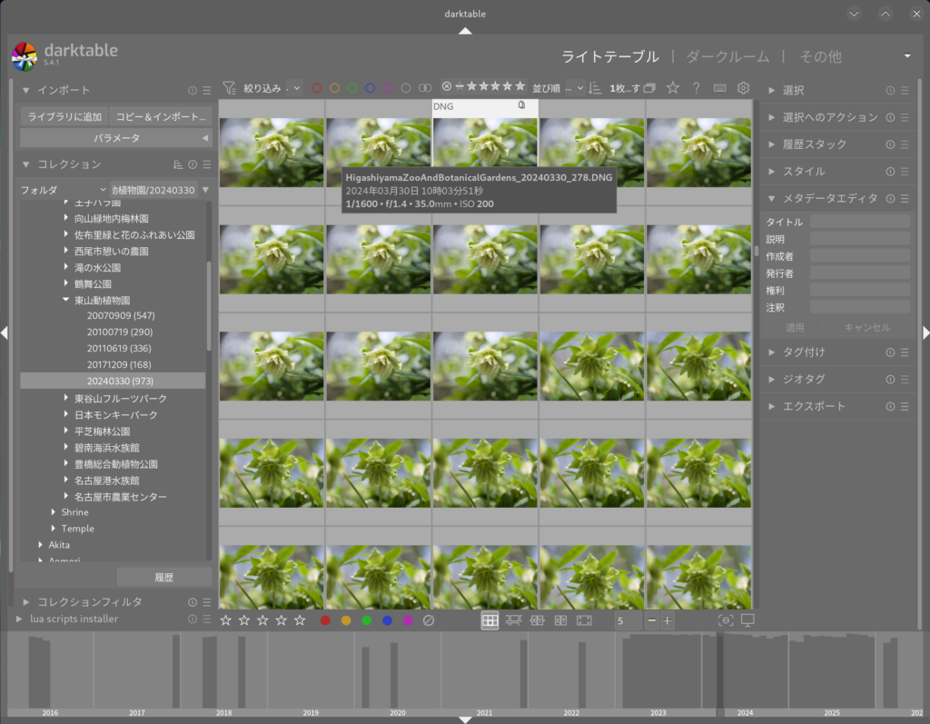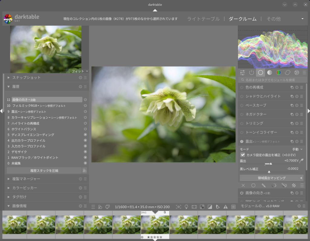 なお、こちらのモードでも画面下部に簡易的なLighttableのように連続した写真が表示されており、ダブルクリックによってDarkroomモードが読み込んでいる写真を切り替えることが可能です。