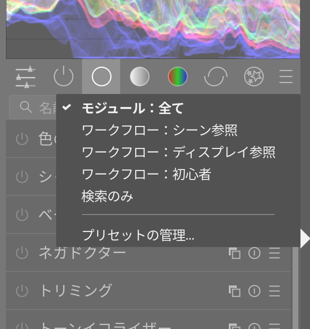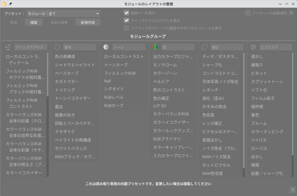そこでDarktableでは、ユーザのワークフローに応じたモジュールメニューのカスタマイズが可能となっています。プリセットのモジュールメニュー右端のハンバーガーアイコンをクリックして表示されるダイアログから、各ワークフローのプリセットをクリック1つで呼び出すことができるほか、それぞれプリセットのカスタマイズについては一番下の「プリセットの管理...」から行えます。