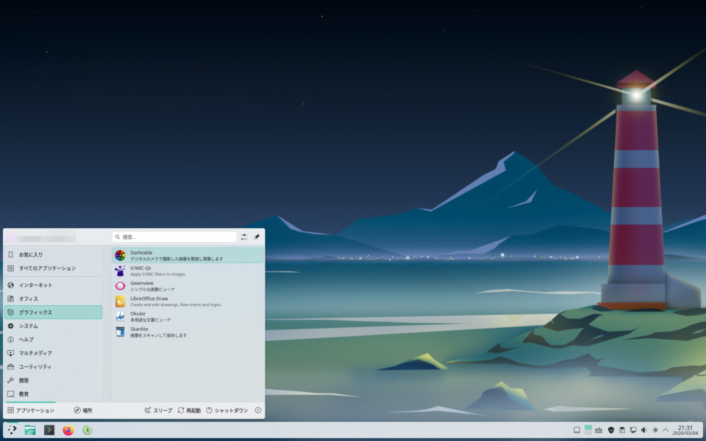 インストールが完了したらアプリケーションメニューの「グラフィックス」にDarktableが登録されます。