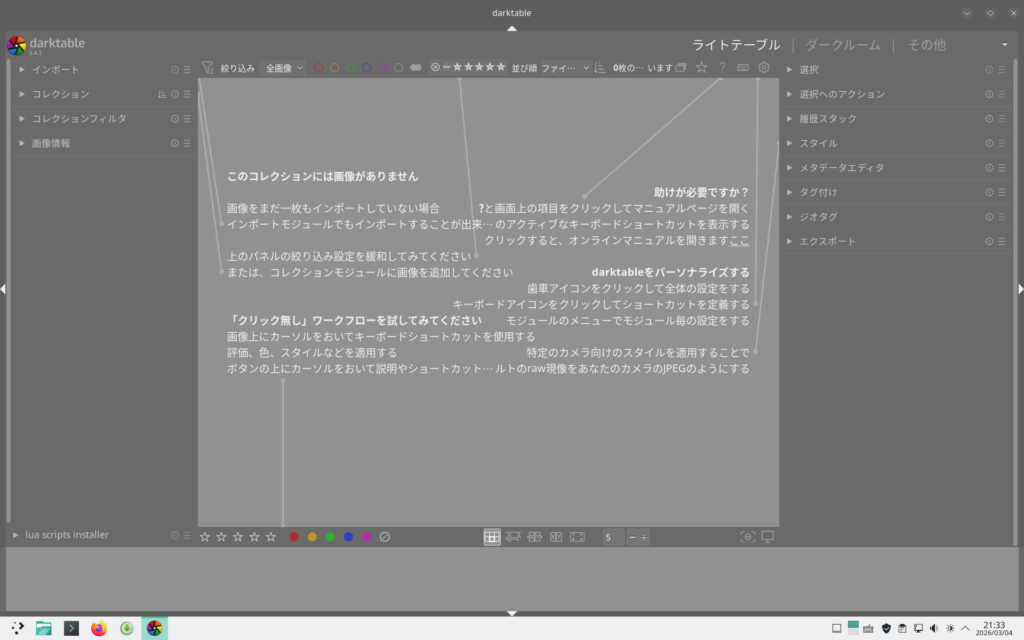 インストール後のテーマ設定 Darktableのメニューバーやタイトルバー等のGUIは、OS側のテーマと連携しておらず、Darktable独自のユーザインタフェースデザインで表示されます。Darktable独自テーマも何 […]