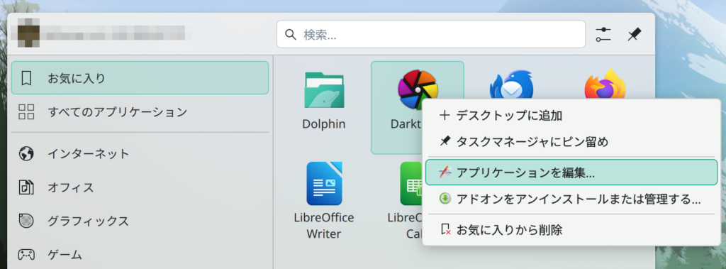 Fig.1-1: アプリケーションメニューからDarktableアイコンを右クリック→アプリケーションを編集