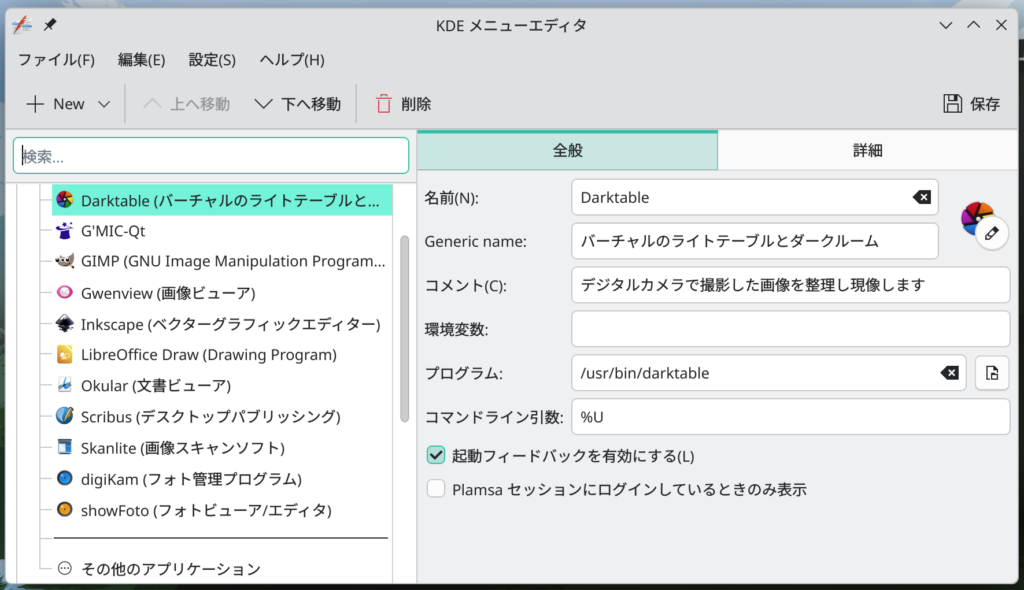 するとKDEメニューエディタが開き、実行プログラムが/usr/bin/darktableであることが確認できます。
