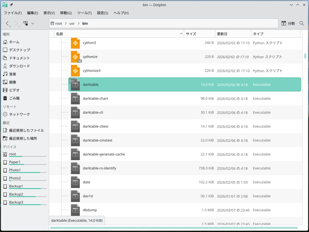 このように、確かにdarktable本体に加えて、darktable-chart, darktable-cli, darktable-cltest, darktable-cmstest, darktable-generate-cache, darktable-rs-indentifyといった関連プログラム群もここにインストール済みであることがわかります。