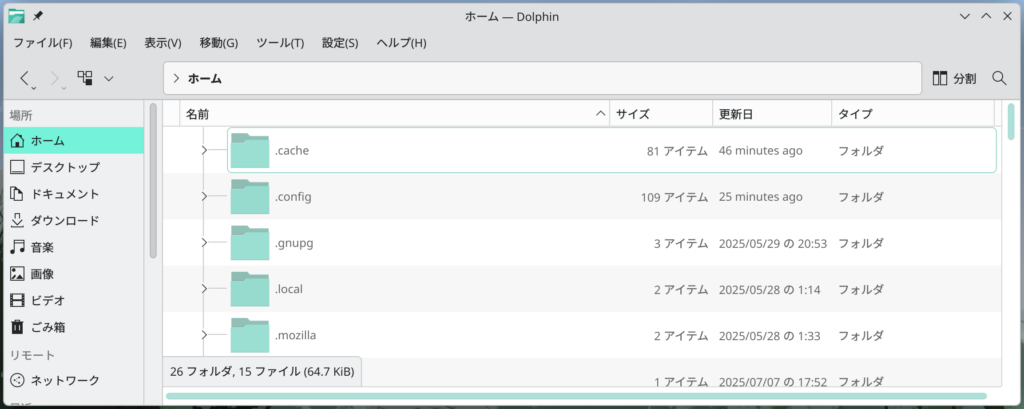 ただ、ここで少し注意が必要な点があり、HOMEは各ユーザのホームディレクトリ直下を指していますが、Dolphinファイルマネージャを開いても該当のディレクトリ「.cache」は見当たりません。これはLinuxでは先頭がドット「.」で始まるディレクトリは非表示扱いになっているためです。Dolphinファイルマネージャでこれらの隠しディレクトリおよび隠しファイルを表示するためには、メニューから「隠しファイルを表示」にチェックを入れて有効化する必要があります。