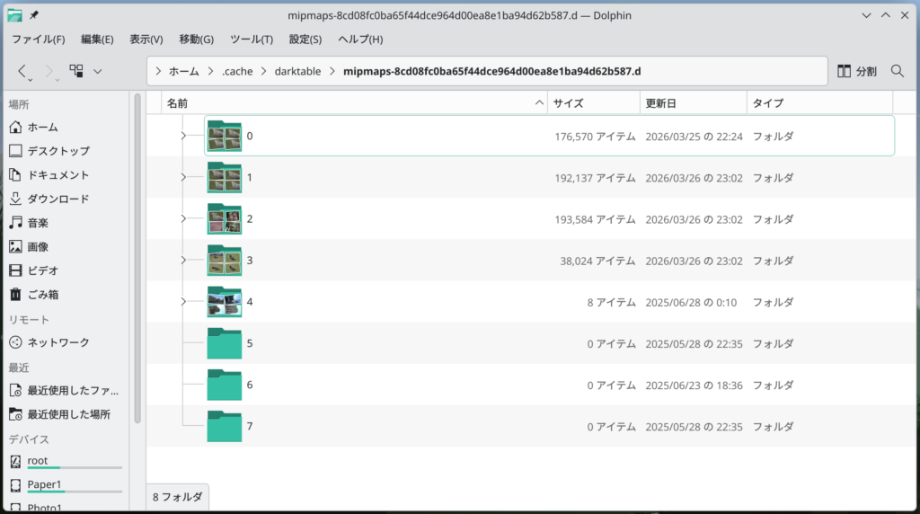 この/.cache/darktable/の中に、キャッシュ保存用のディレクトリが生成されています。