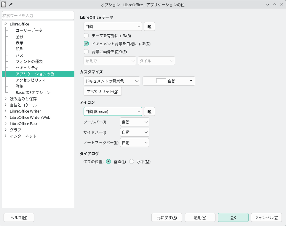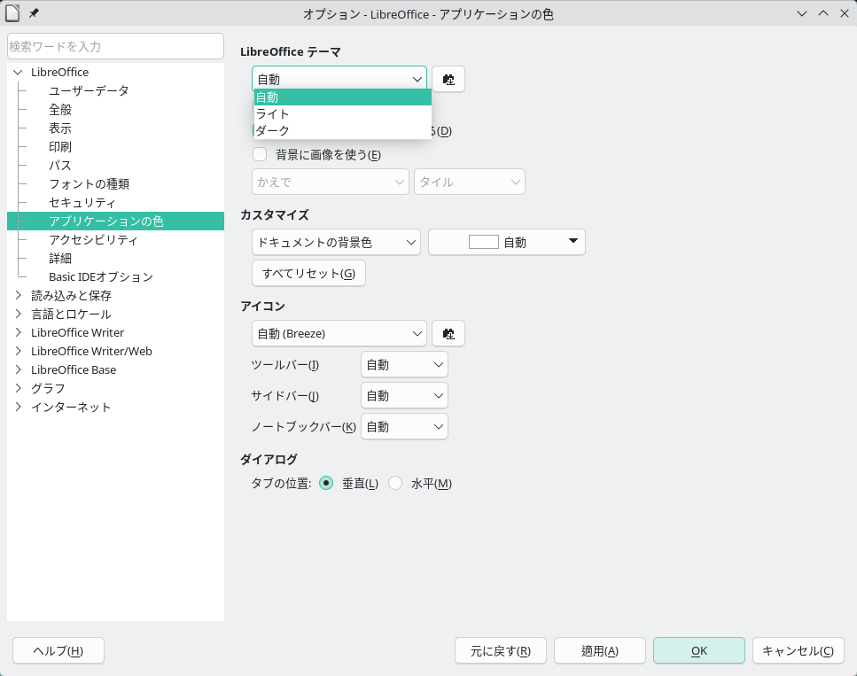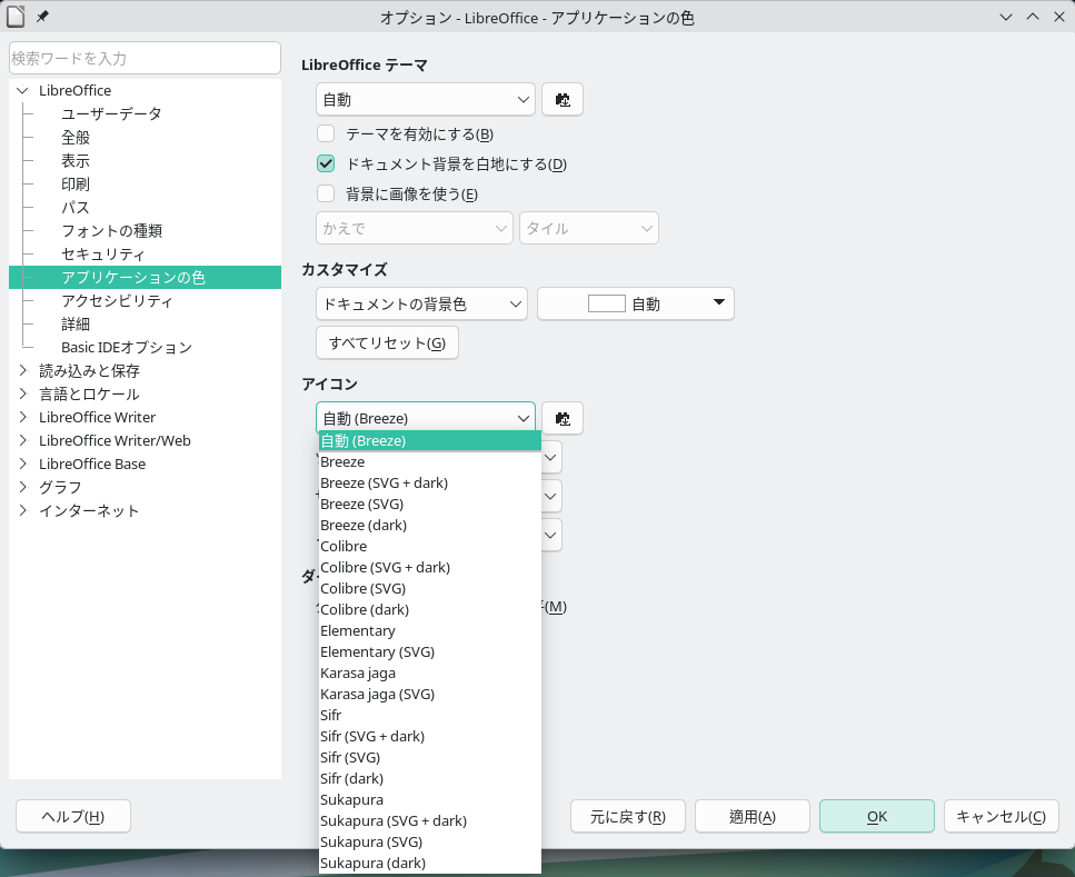 さて、ここではGUIの色調そのものは他のソフトウェアとの統一感のためOS側の設定に任せて「自動」としておくとして、LibreOfficeのみに適用されるツールバーのアイコンに好みのデザインを指定してみましょう。