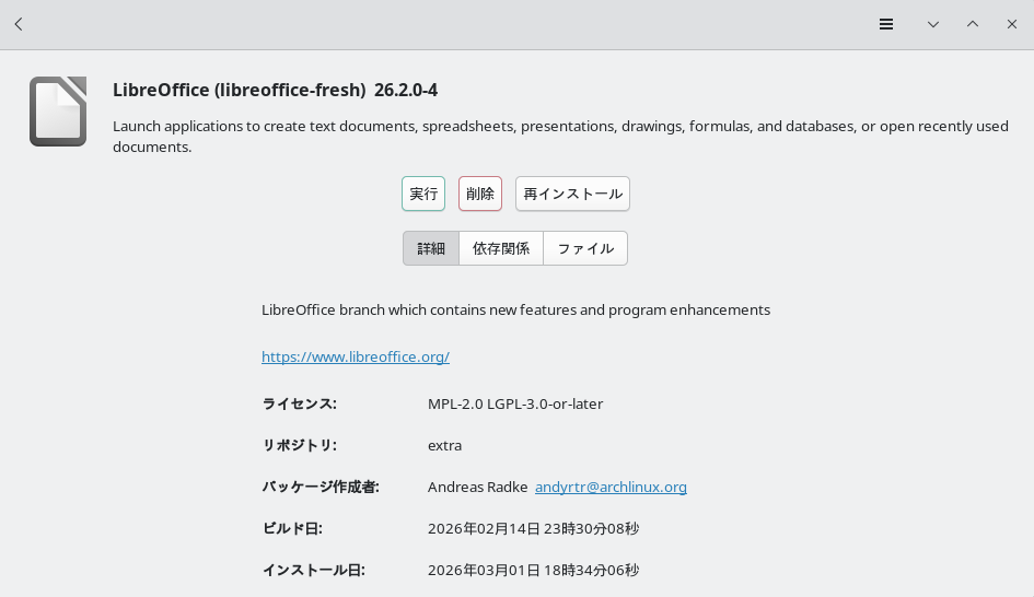 Fig.1-1: パッケージマネージャ上のLibreOffice fresh版