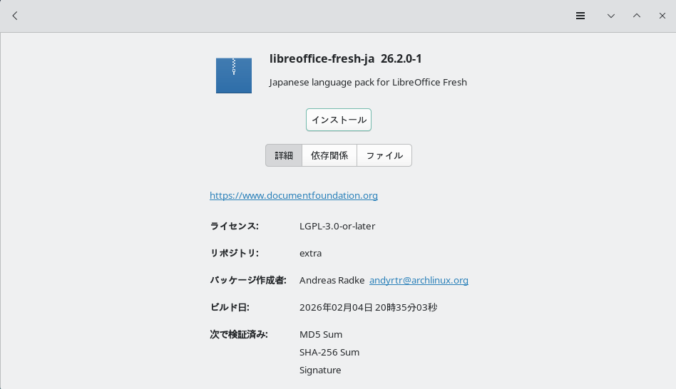 Fig.1-2: パッケージマネージャ上のLibreOffice fresh版 日本語言語パック