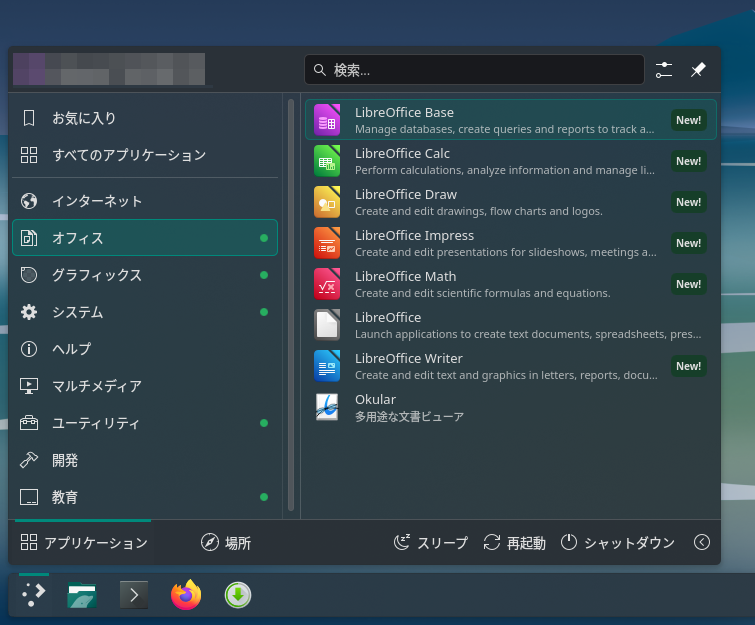 これもボタン1つでインストールできるので簡単です。インストールが完了したらアプリケーションメニューの「オフィス」に以下のソフトウェアが登録されます。