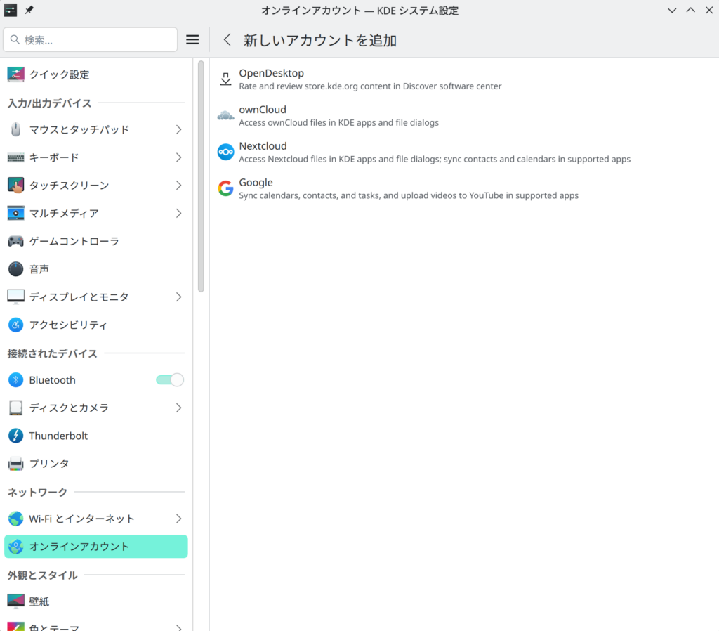 Fig.1-1: KDEシステム設定から追加できるオンラインアカウントはこの4種類のみ