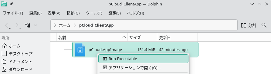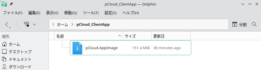 ここでは一例としてホームディレクトリ直下に「pCloud_ClientApp」というディレクトリを作成し、その下にダウンロードしたAppImageファイルを配置しました。