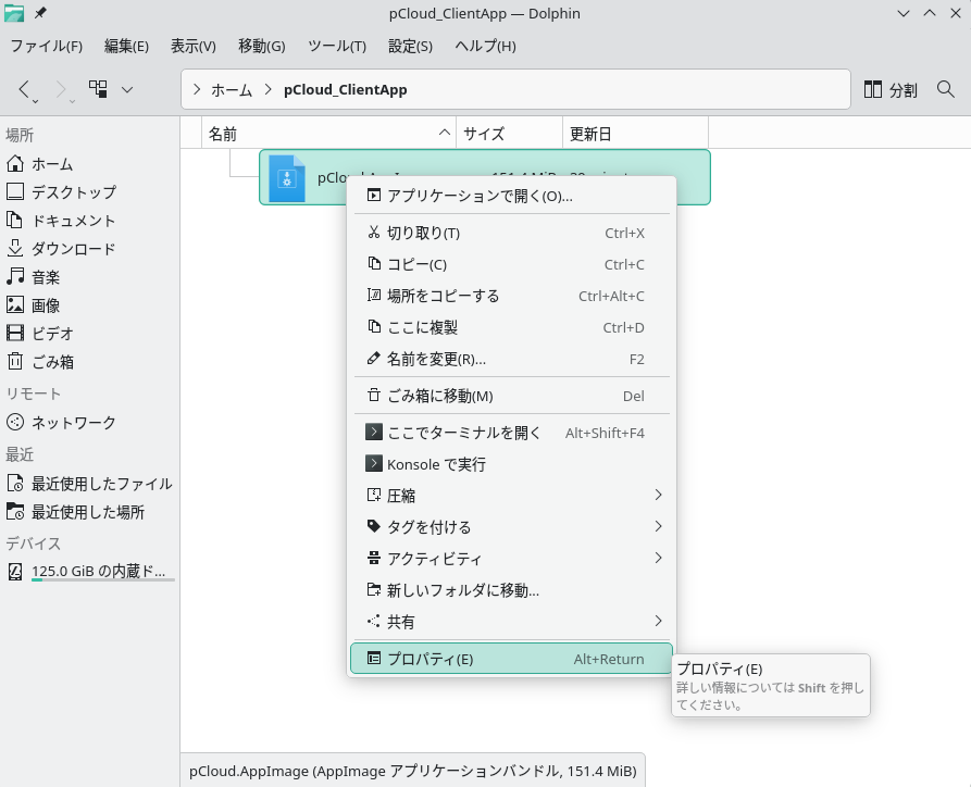 しかしこの時点ではまだアプリケーションを実行することはできません。セキュリティのため、ダウンロードした直後のAppImageファイルは実行不可能な状態に設定されています。この設定を変更するためファイルを右クリックし、表示されたコンテキストメニュー上の「プロパティ」ダイアログを開いてください。