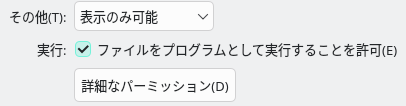 プロパティのダイアログから「パーミッション」タブを開き、中央の「ファイルをプログラムとして実行することを許可」チェックボックスをオンにします。