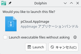 Manjaro KDE標準のファイルマネージャDolphinの初期設定では、ユーザの直接操作によるAppImageアプリケーションファイルの実行時に確認ダイアログが表示されるようになっています。問題ありませんので「Launch」ボタンを押して実行を進めてください。