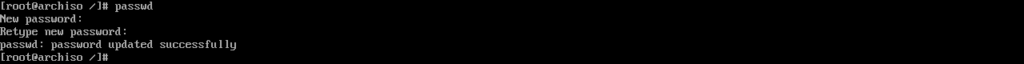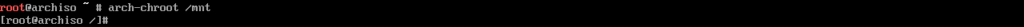 ここまで、isoイメージから起動したインストーラ役のArch Linux上のrootディレクトリでの操作が続いてきましたが、ひとまずインストール先ストレージへの主要なファイル配置は行われましたので、ここでarch-chrootスクリプトを用いてインストール先OS環境側へとルートディレクトリを切り替えます。