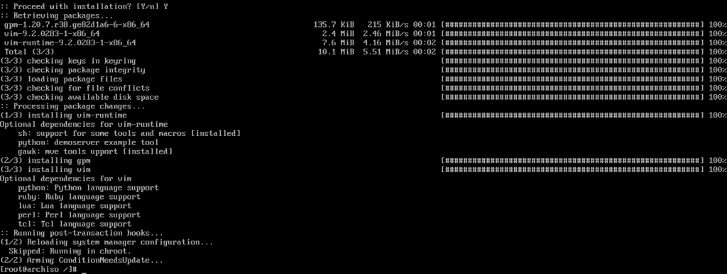 それでは、ロケールの設定に取り掛かりましょう。ただし、前述の通りchroot中にはlocalectlコマンドが使えないため、ここではテキストファイルを直接編集する必要があり、したがってまずは何らかのテキストエディタがなければいけません。今回は例としてテキストエディタvimをインストールして操作を進めていきます。