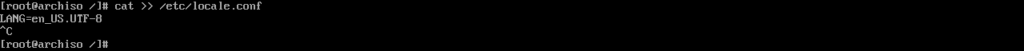 次に、OSの各種ロケール環境変数を格納するためのlocale.confファイルを新規作成し、同時に言語ロケールを英語に指定する記述を書き込みます。