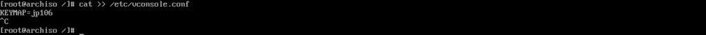 さらに、永続的なキーマップ設定のためのvconsole.confファイルを新規作成し、同時にキーボードレイアウトを現在使用しているキーボードと一致させる記述を書き込みます。ここでは、106日本語キーボードを使っているものとして解説を進めます。
