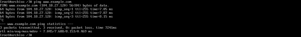 また、念のためここで一度pingコマンドを使ってインターネット接続が可能かどうか確認しておきましょう。後ほど再起動して、インストールされた環境単体で起動した時にはこれと同じ事をしても一時的に繋がらなくなってしまいますが、それについてはまた別途解説と設定を行います。