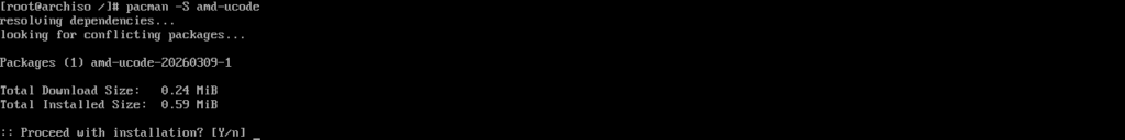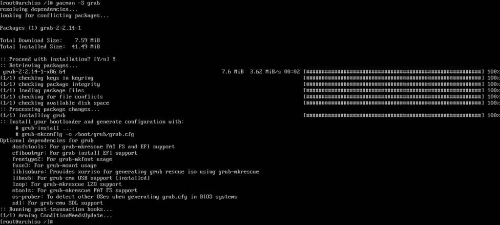本記事においてもGRUBを例に解説を進めていきます。まずはpacmanパッケージマネージャからGRUBをインストールしましょう。