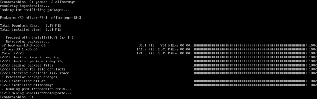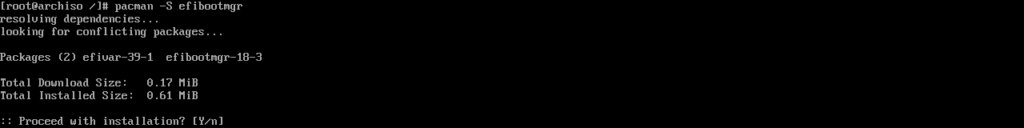 また、今回はマザーボード側のUEFI有効化した状態でのArch Linuxインストールを進めているので、GRUBに加えてefibootmgrもインストールしなくてはいけません。このefibootmgrはマザーボード上に物理実装されたUEFI用NVRAM(Non Volatile RAMの略で、電源を切っても消えない不揮発性の記憶領域)に登録されたブートエントリの内容や順番設定を表示・変更するためのコマンドで、内部的にGRUBによって使用されます。