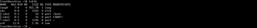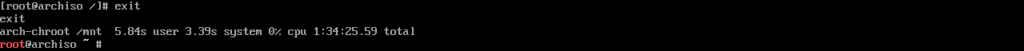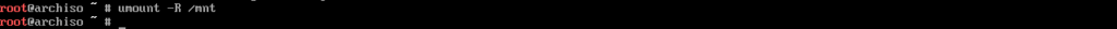 これにて、Arch Linuxのインストーラ側での操作は完了です。インストーラ側の/mntにマウントされているOSインストール先パーティション全てをアンマウントして切り離しましょう。