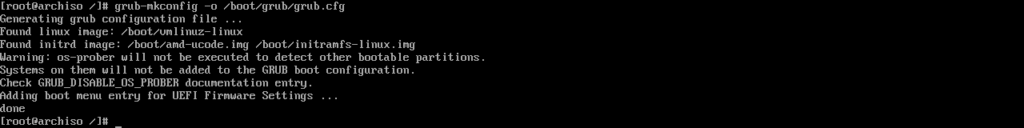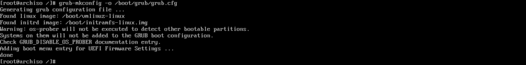 問題なくgrub-installコマンドが完了したら、メインのGRUBディレクトリ/boot/grubが生成されますので、次にgrub-mkconfigコマンドを用いてその直下にGRUB設定ファイルも生成します。