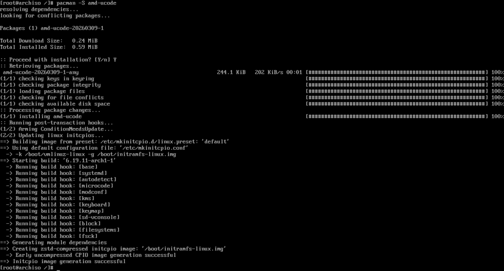 通常、初期RAMディスク(Initramfs)の作成は、OSインストール先パーティションに対するpacstrapスクリプトによるカーネルパッケージのインストール時に内部的にmkinitcpioスクリプトが動作することで自動作成されているため、手動で行う必要はありません。ただし、インストール先が以下に挙げるいずれか特殊な環境であった場合は手動で行う必要があります。