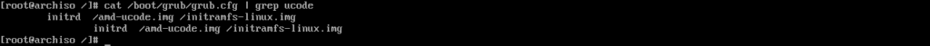参考画像のように「initrd」以降の記述が書き込まれていることがわかります。initrdは起動直後にブートローダによって最初に読み込まれる初期RAMディスクのファイルシステムで、ここにはカーネルに先行して起動するinitramfs-linuxが割り当てられていますが、この再生されたgrub.cfgにおいてはそれよりもさらに先行してマイクロコードアップデートが割り当てられています。