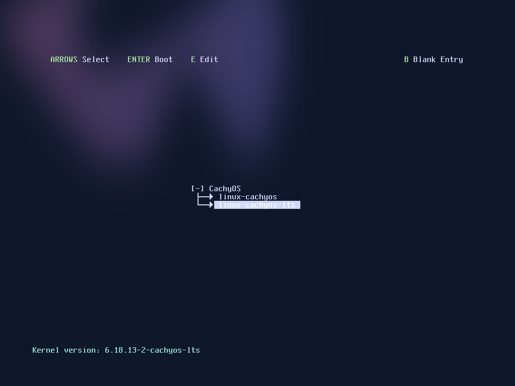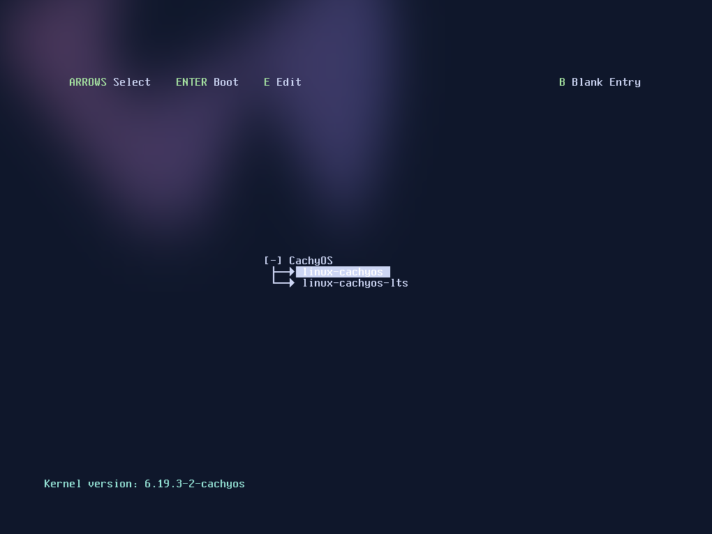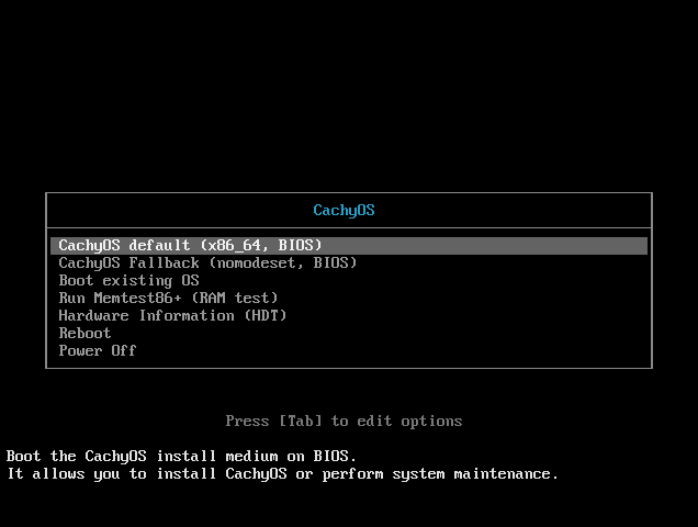 まずは一番上の「CachyOS default (x86_64, BIOS)」を選択してEnterキーを押して進めると、Liveモードが起動します。