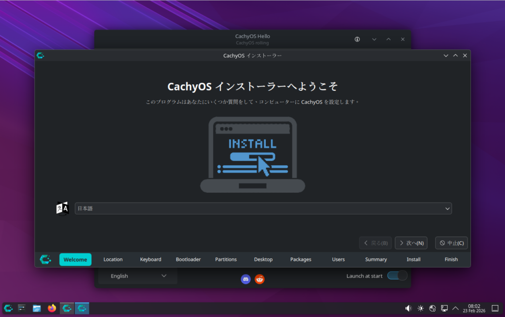 まだこの時点でデスクトップ環境の指定はしていませんが、Liveモードは自動的にKDEデスクトップ環境で表示されます。またWelcomeダイアログが画面中央に表示され、このWelcomeダイアログ上のINSTALLATION / Launch installerをクリックすることで、インストーラが開始されます。