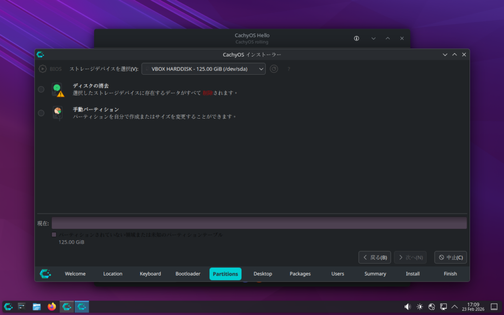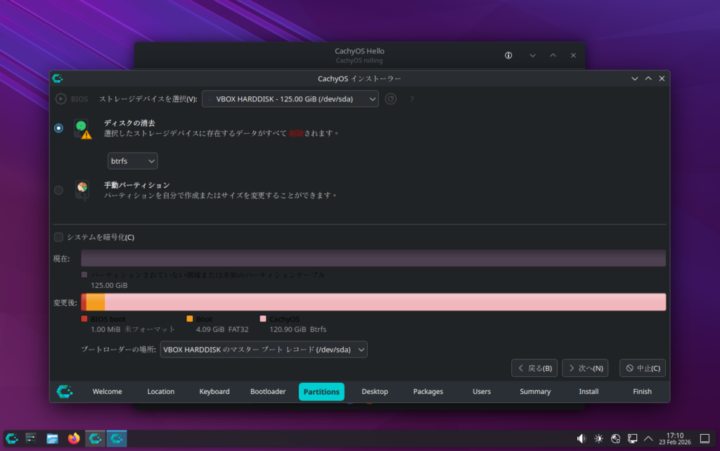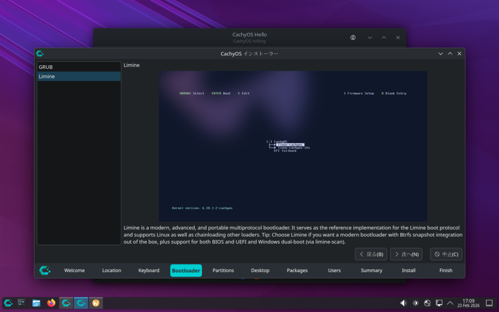 GRUBとLimineのうち、デフォルトでLimineが選択されています。特にGRUBにこだわりがなければそのままLimineのまま「次へ」を押して進めます。