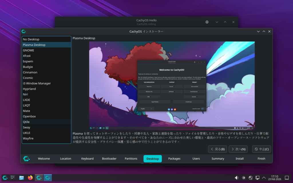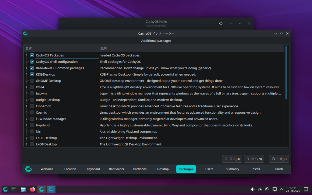 非常に多くの選択肢がありますが、ここではPlasma Desktop (KDE Plasma)を選択します。ボタン「次へ」を押して進めると、インストールされる内容が表示されます。