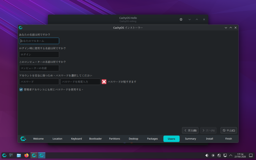 CachyOSのインストーラでは、パスワードを入力せず自動ログインする設定はありません。