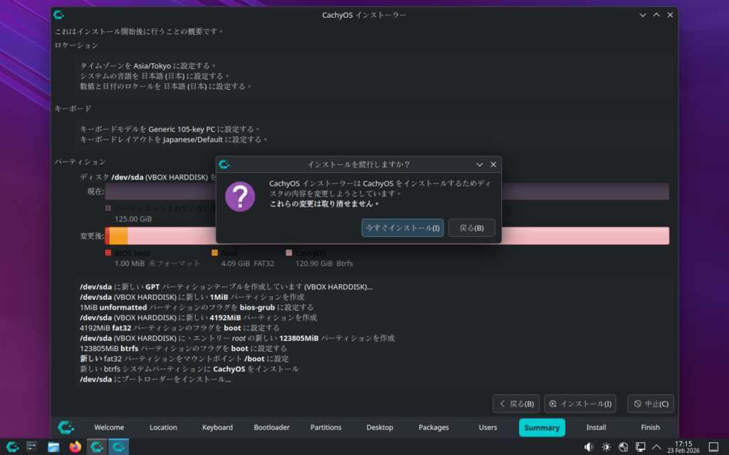 ボタン「インストール」を押すと最終確認ダイアログが表示されます。