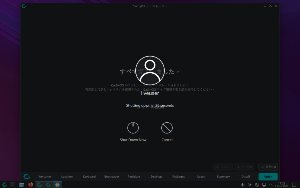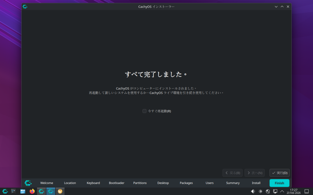 ここでは一旦シャットダウンしてから落ち着いてインストールメディアを取り外し、改めて電源ボタンで起動するという手順を踏みましたが、もちろんインストーラの「今すぐ再起動」にチェックを入れて実行し、再起動をかけても構いません。