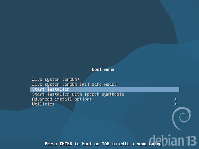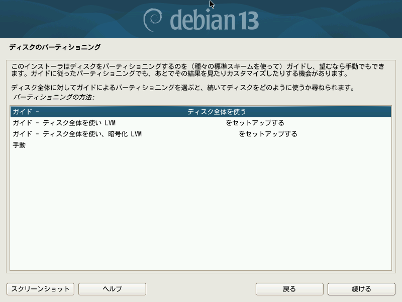 Debian 13のisoイメージから作成したインストールメディアを起動ドライブに指定してコンピュータを起動すると、オプションの選択肢一覧が表示されます。