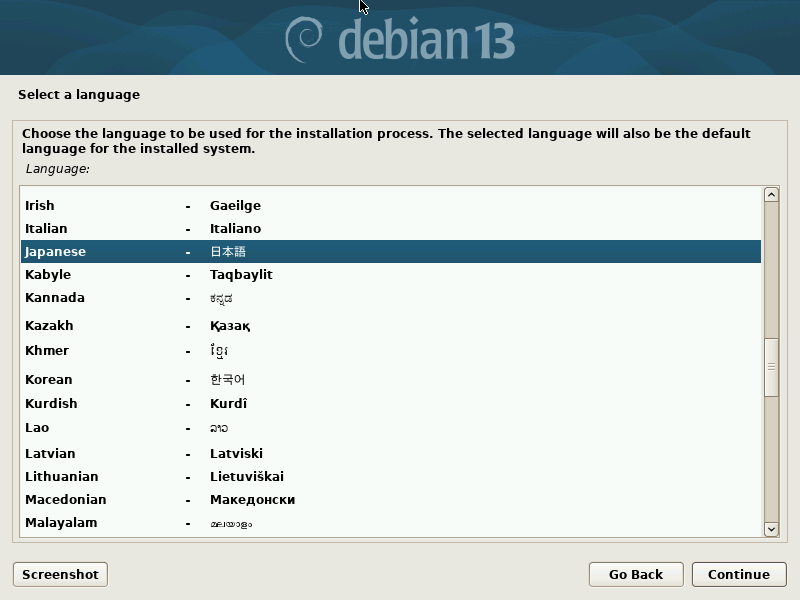 ボタン「Continue」を押して進めると、インストーラの言語もここで指定したものに切り替わります。
