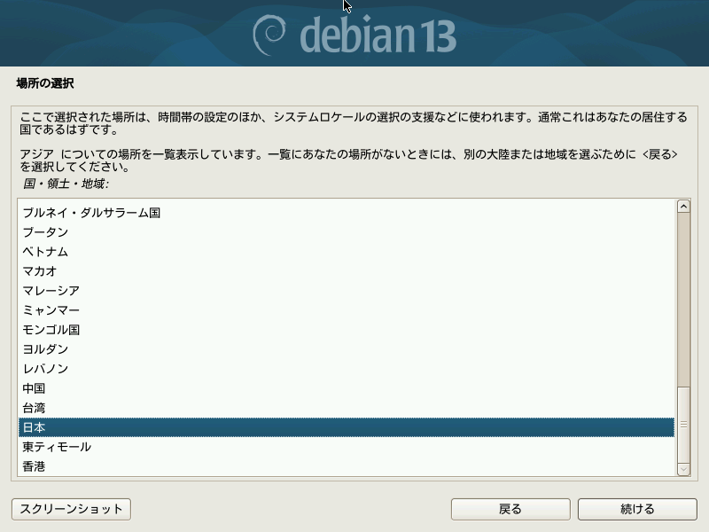 言語選択画面で日本語を指定した場合、自動的に日本が選択されています。