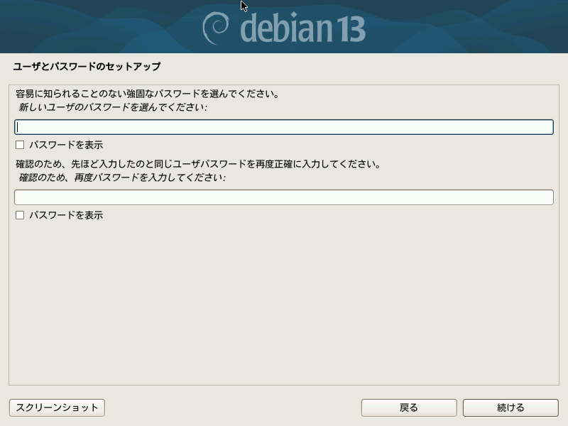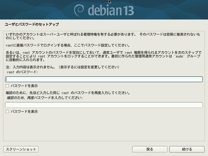 次にrootアカウントのパスワード設定画面となりますが、rootを無効にしてメインユーザで運用する場合は空欄のままボタン「続ける」を押して進めます。