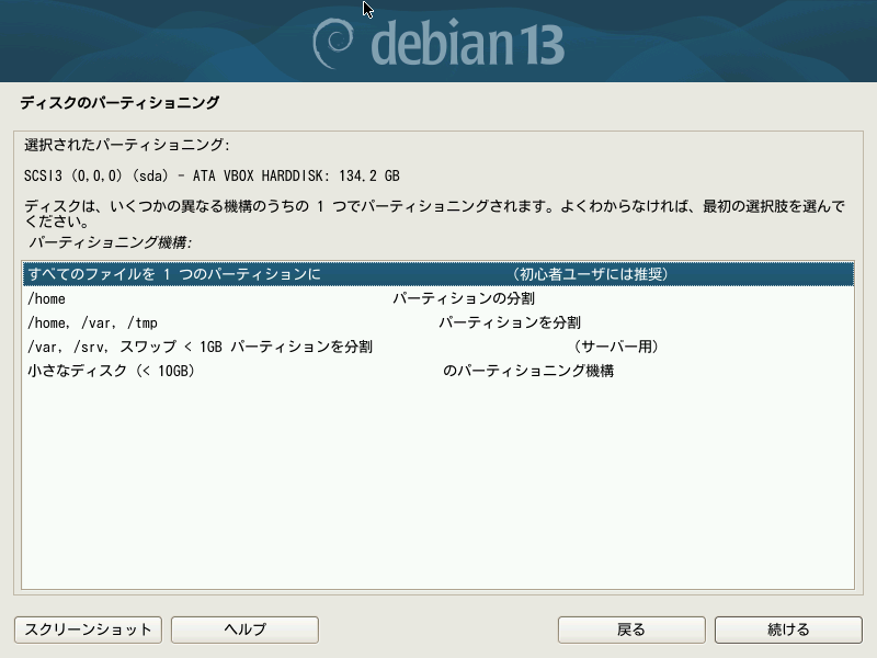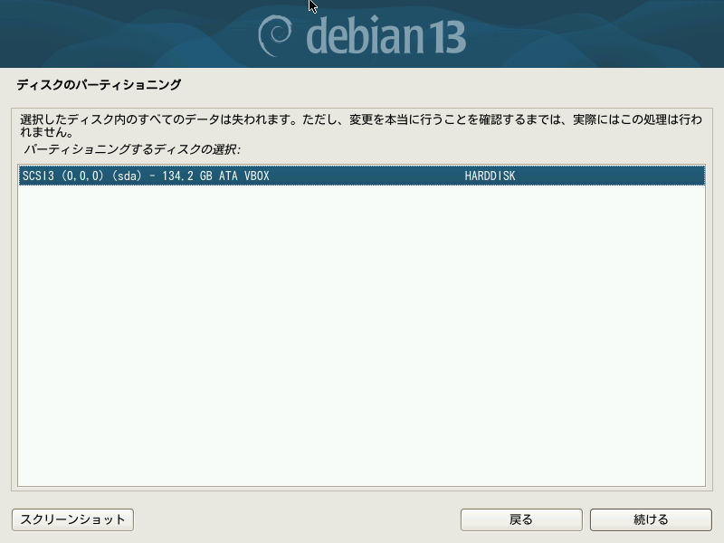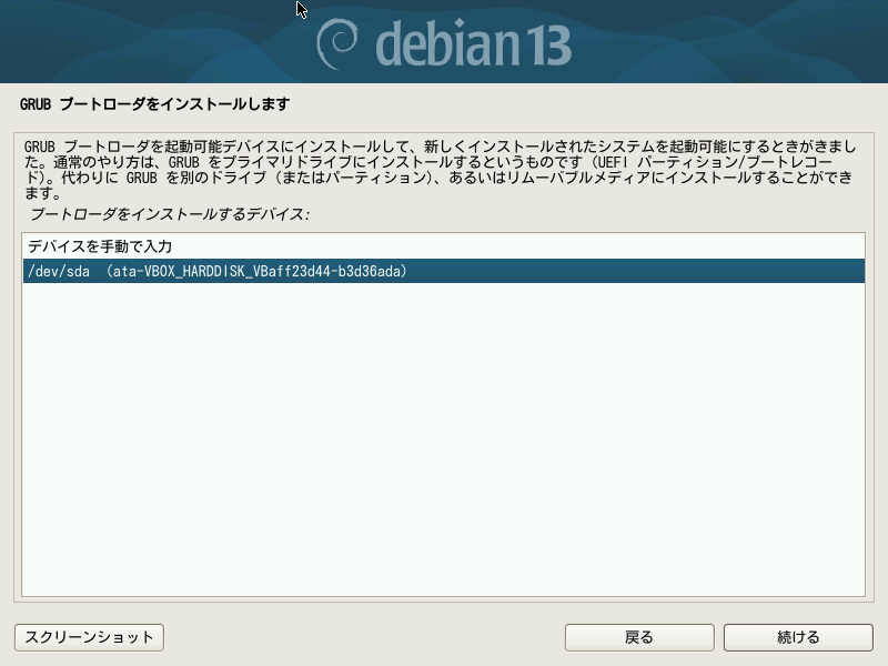 インストール先を選択できますが、Debianだけを単一のドライブにインストールするシンプルな環境の場合は下段の/dev/sdaを選ぶだけで大丈夫です。ボタン「続ける」を押して進めます。
