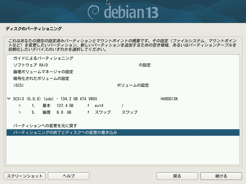 上記の画面のうち、最後の準備完了から実際にパーティショニングを開始するには「パーティショニングの終了とディスクへの変更の書き込み」を選択する必要があります。それからボタン「続ける」で進めてください。