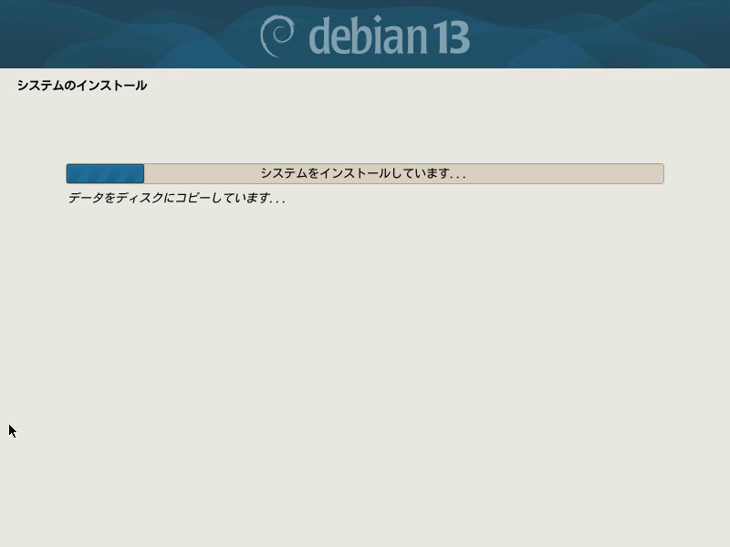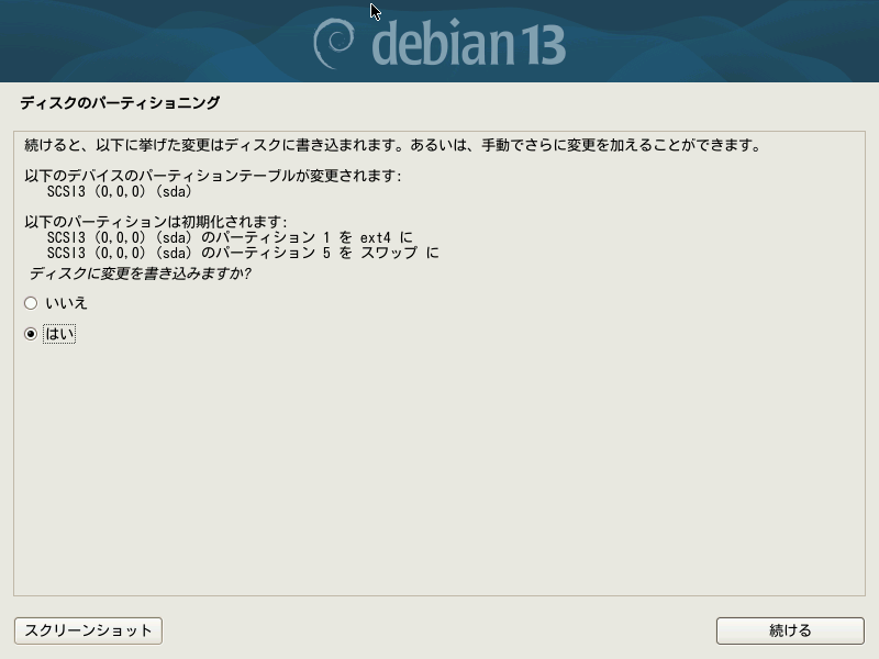 ここでもラジオボタン「はい」のほうに選択を切り替えてから、ボタン「続ける」を押すと、ディスクドライブのパーティショニングとシステムのインストールが始まります。