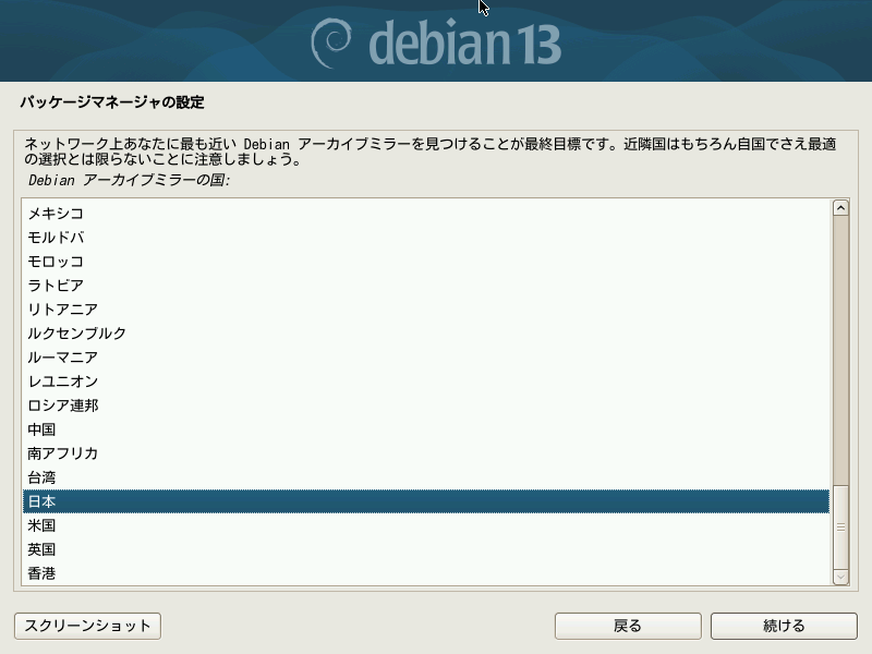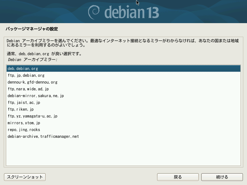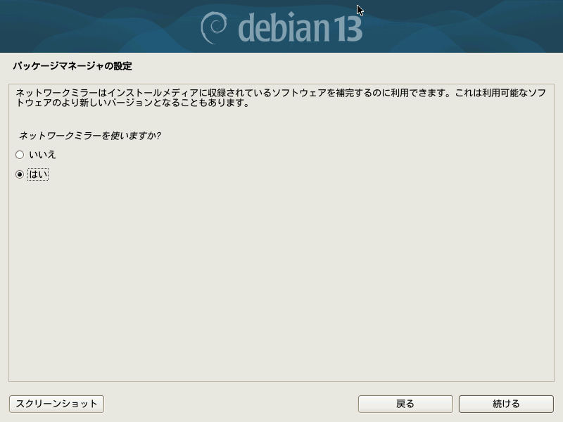 パッケージマネージャの設定を行うことで、インターネットに接続された状態でインストールを進めている場合はより新しいバージョンを入手できます。ラジオボタンを「はい」にして進めます。