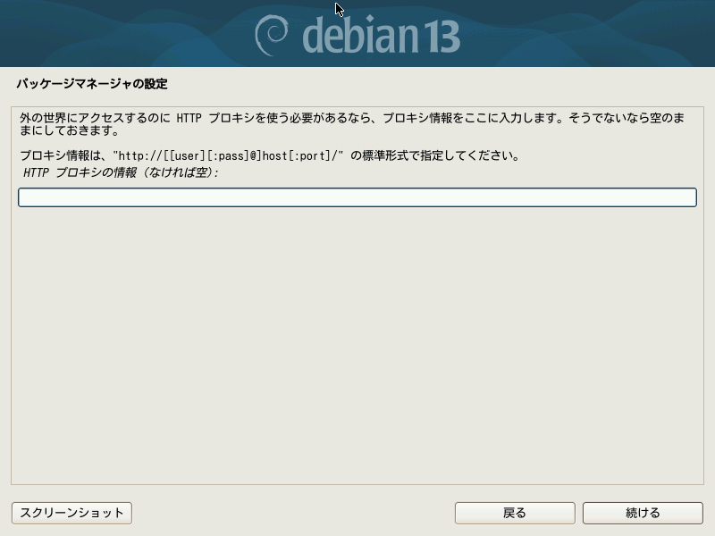 もしプロキシ設定が必要な場合はここで入力できます。不要あるいは不明な場合は空欄のまま進めましょう。