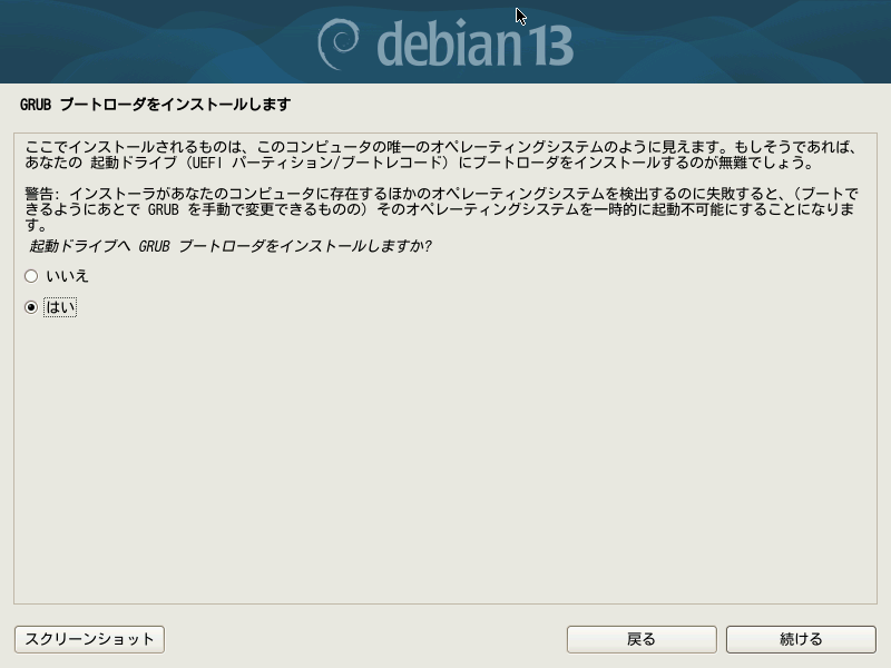 次に、ブートローダーのインストールについての確認画面が表示されます。