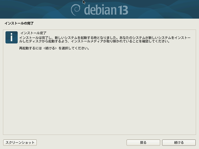 ブートローダのインストールが済んだら、Debianのインストールはすべて完了です。