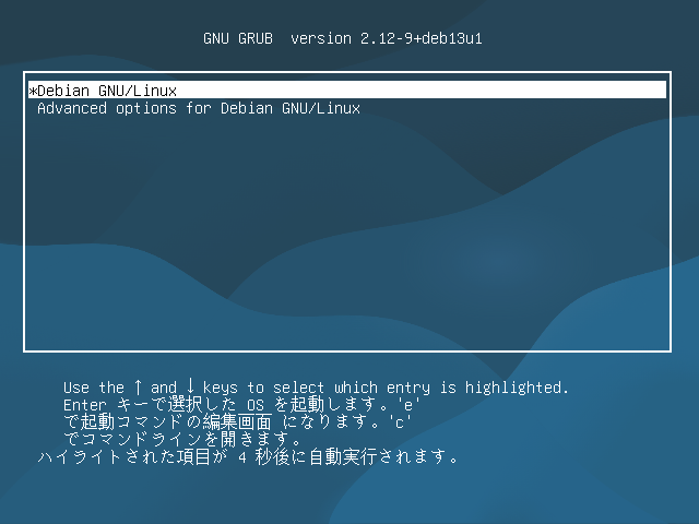 無事インストールが成功していれば、起動後にブートメニューが表示されます。