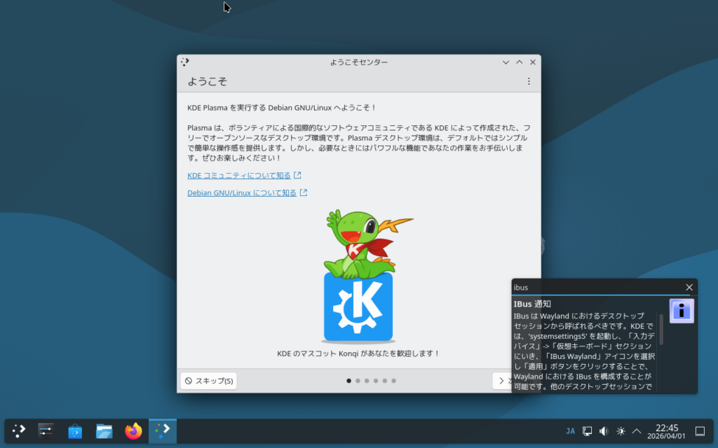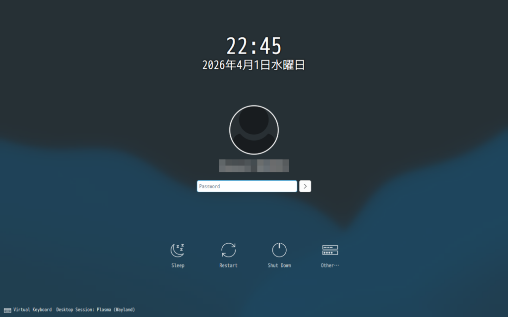 画面左下にDesktop Sessionとして、Plasma (Wayland)が表示されています。