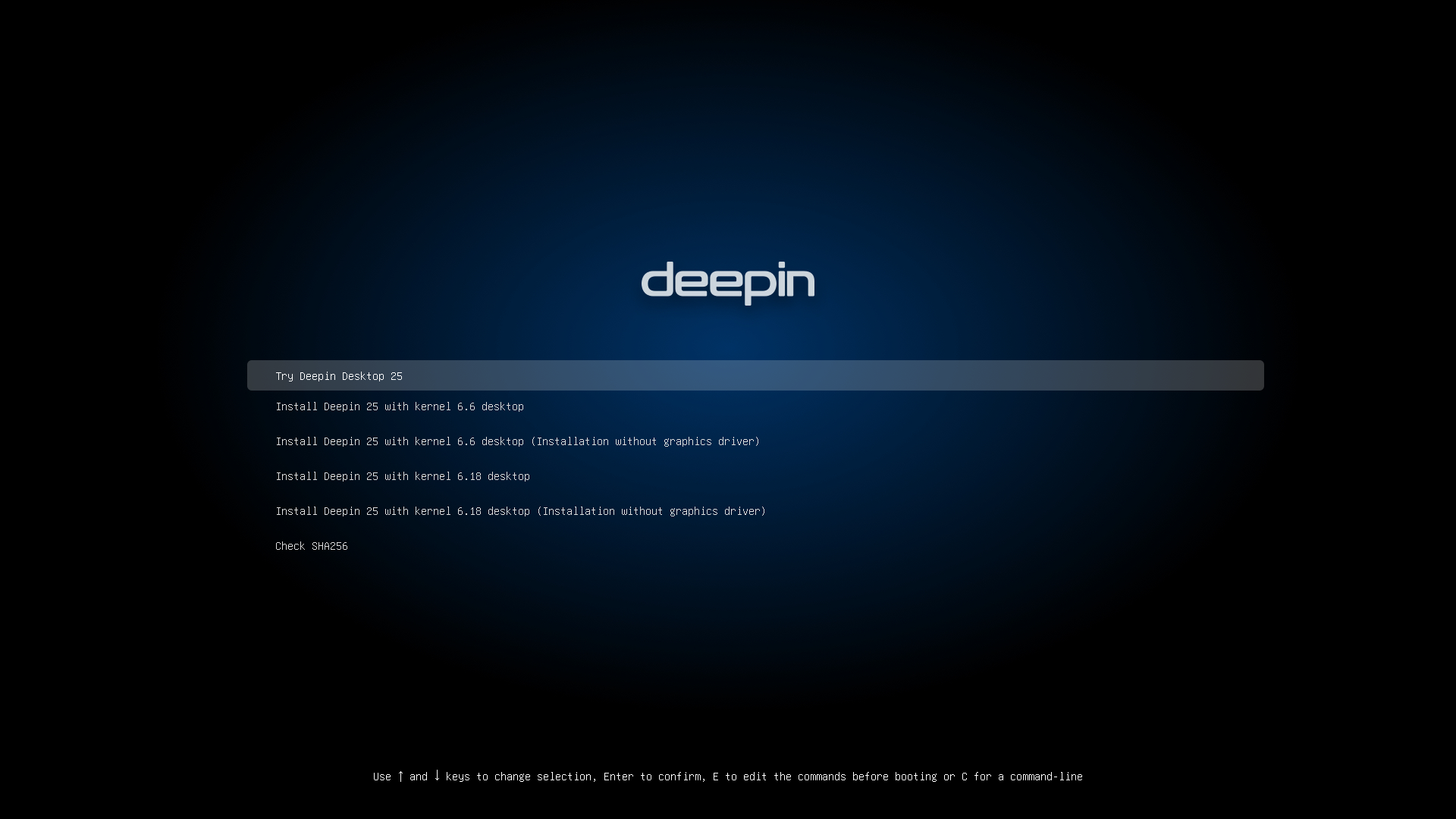 選択肢としてはLiveモード用の「Try Deepin Desktop 25」のほか、カーネルの世代やグラフィックドライバの有無に対応するいくつかのインストーラが準備されています。このグラフィックドライバの内容については表記されていませんが、他の多くのLinuxディストリビューションで見られるようにNVIDIA製プロプライエタリドライバの事を指しているものと考えられます。